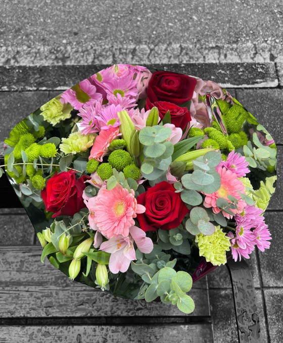Ramo en tonos rosados y con rosas rojas.